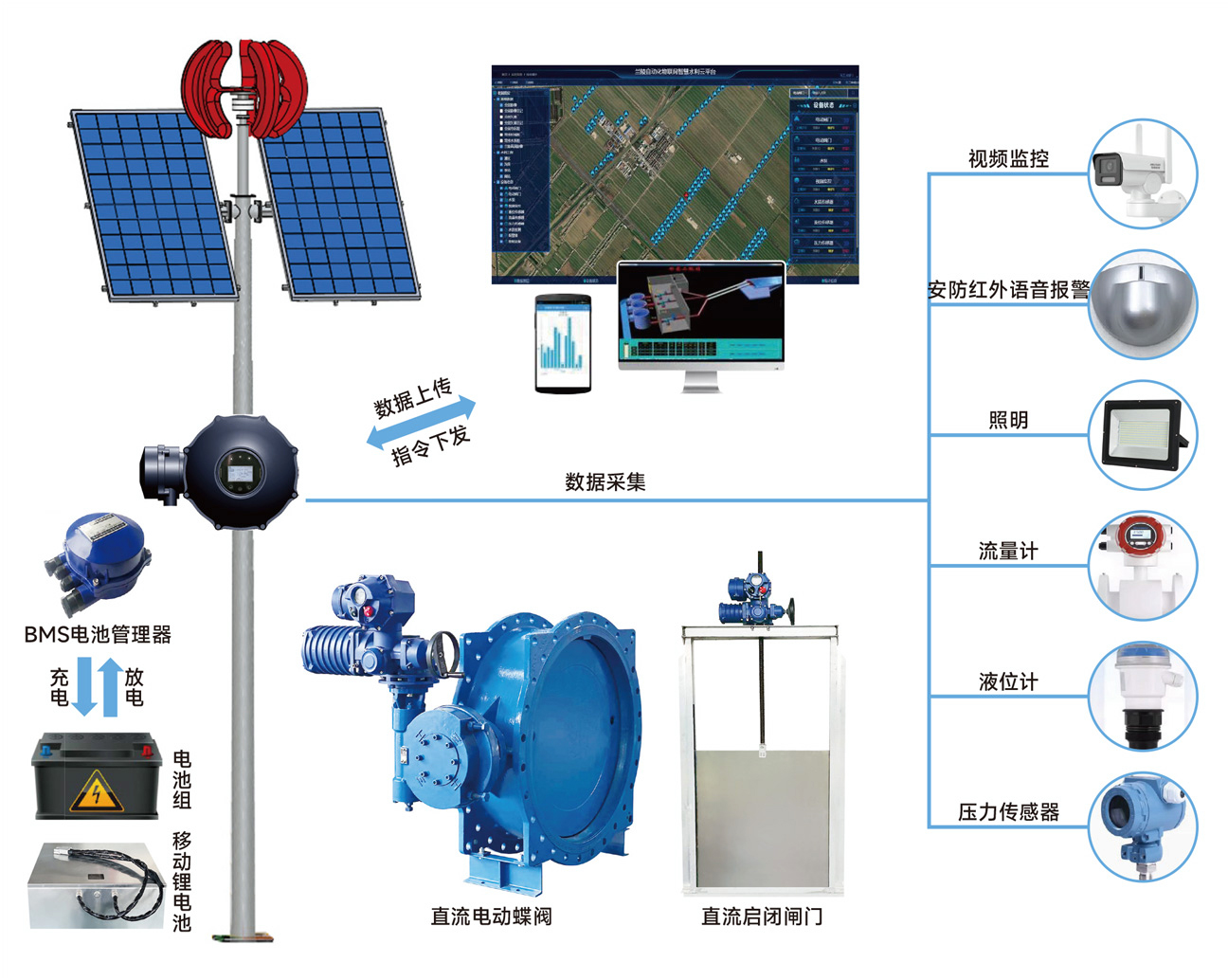 由太陽(yáng)能光伏板和小型風(fēng)力發(fā)電機(jī)為蓄能電池組充電,電池組有BMS電池管理軟件管控,為永磁無(wú)刷直流電機(jī)的各類驅(qū)動(dòng)裝置供電,同時(shí)為視頻監(jiān)控,壓力、流量、液位傳感器,照明等供電